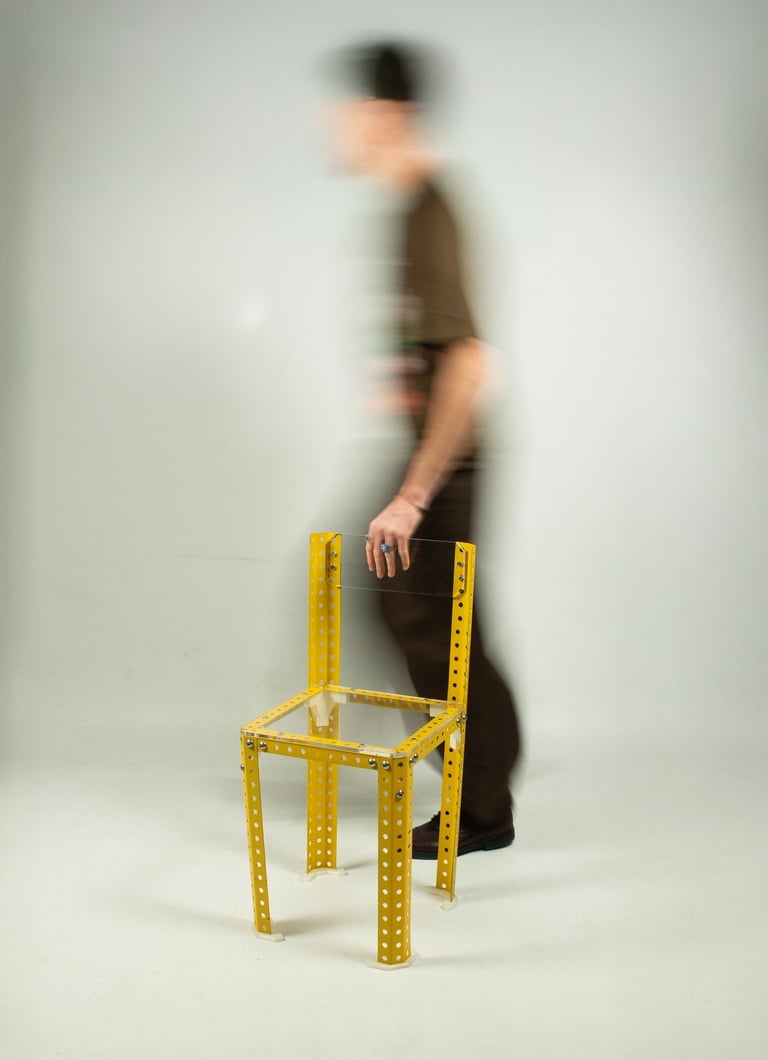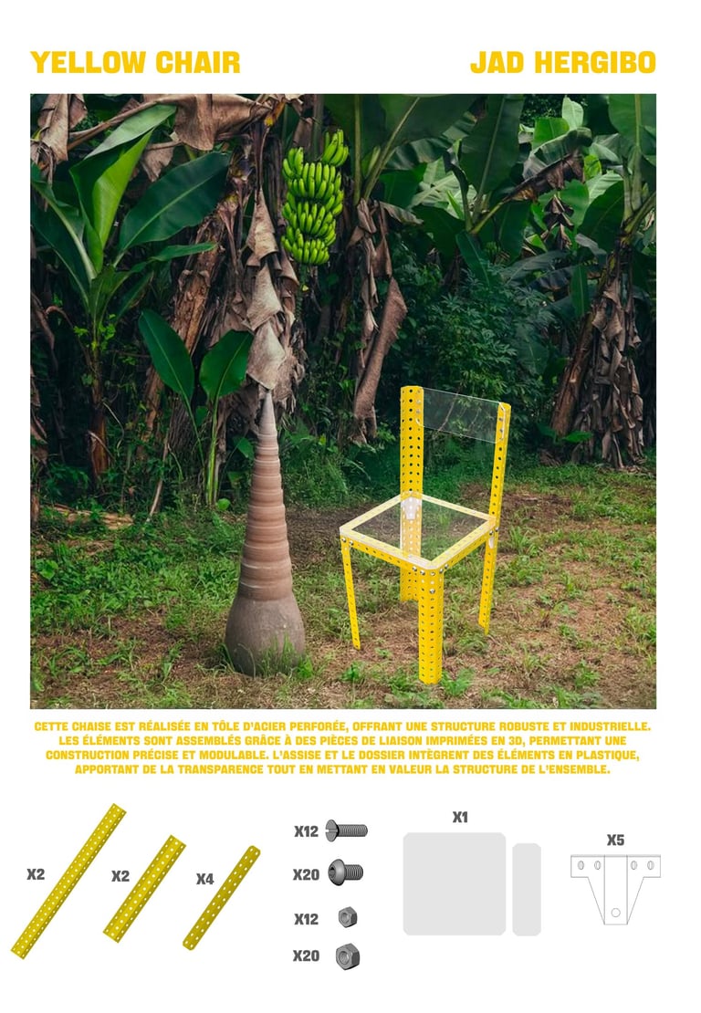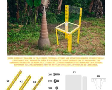 Pour la fabrication, j’ai utilisé plusieurs procédés : la découpe et la perforation du métal par plasma, ainsi que l’impression 3D pour concevoir des pièces de liaison spécifiques. Cette combinaison de techniques permet de mettre en valeur la logique constructive de la chaise et sa dimension modulaire.