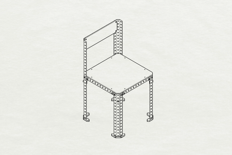 Le projet s’inspire à la fois du principe des jeux de construction type Meccano et de l’esthétique du mobilier industriel. L’objectif était de créer un objet démontable, lisible dans sa structure et assumant la visibilité de ses systèmes d’assemblage.